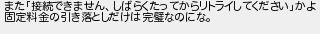 また接続できませんしばらくたってからリトライしてくださいかよ 固定料金の引き落としだけは完なのにな