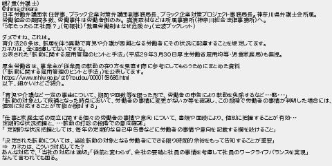 嶋量弁護士 日本労働弁護団常任幹事ブラック企業対策弁護団副事務局長ブラック企業対策プロジェクト事務局長神奈川県弁護士会所属 労働組合の顧問多数労働事件は労働者側のみ 講演取材などは所属事務所神奈川総合法律事務所へ 年たったら正社員?旬報社裁量労働制はなぜ危険か岩波ブックレット ダメですねこれは 育介法26条は転居を伴う異動で育児や介護が困難となる労働者にその状況に配慮することを規定してます カネカは全く配慮してないですね 公表された転勤に関する雇用管理のヒントと手法平成29年3月30日厚生労働省雇用均等児童家庭局も無視 厚生労働省は事業主が従業員の転勤の在り方を見直す際に参考にしてもらうためにまとめた資料 転勤に関する雇用管理のヒントと手法を公表してます 以下細かいけどご紹介 育児や介護など一定の事由について期間や回数等を限った形で労働者の申告により転勤を免除するなど略 転勤の対象として候補となった時点において労働者の事情に変更がないか等を確認しこの段階で労働者の事情が判明した場合には 個別に対応することが可能か検討する 仕事と家庭生活の両立に関する個の労働者の事情や意向 について書類や面談により個別に把握することが有効 定期的な状況把握と転勤の打診の段階での意向確認 定期的な状況把握としては毎年の定期的な自己申告書などに労働者の事情や意向を記載する欄を設けること 決定された転勤については当該転勤の対象となる労働者にできる限り時間的余裕をもって告知することが重要 カネカはこういう対応してた? あんな対応で当社の対応は適切従前と変わらず会社の要請と社員の事情を考慮して社員のワークライフバランスを実現 なんて言われても困る