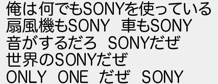 623: [] 2019/08/01(木) 22:23:52 ID:cBu239Vi 俺は何でもSONYを使っている 扇風機もSONY 車もSONY 音がするだろ SONYだぜ 世界のSONYだぜ ONLY ONE だぜ SONY http://egg.5ch.io/test/read.cgi/regulate/1556292921/623
