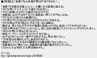 悲報女身長未満の男は子作りするな! 身長未満は正直ムリヒール履いたら普通に越える チビな男ってナルシストで偉そうな奴多い チビと結婚したらチビが産まれるからヤダ 身長低い女の子はモテるけど身長低い男ってモテないよね 子どものこと考えたら無理だわ チビ男が子ども作らなければ日本からチビが消える チビな男は子作り禁止にするべきあと結婚も 最近は男より女の子の方が普通に背高いからね街歩いててもチビばっか 日本の男はまじでチビしかいない逆に女性は背高くてスタイルいい子がホント多い 代の男とか見ると笑っちゃう 婚活パーティーよく行くけどホントちび多い 女子はぐらいが一番モテる気がする男はぐらい 未満は生理的にむり金持ちでもむり 背伸びしてキスするのが理想だから最低限以上ほしい 犯罪者はチビ男ばっか秋葉原の通り魔の事件もチビだったし 2ちゃんで女叩きしてる男は絶対チビ ソース