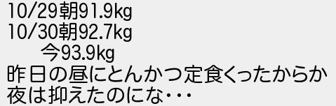 653: [] 2018/10/31(水) 20:46:16.91 ID:8AwlQ718 10/29朝91.9kg 10/30朝92.7kg 今93.9kg 昨日の昼にとんかつ定食くったからか 夜は抑えたのにな・・・ http://rio2016.5ch.net/test/read.cgi/shapeup/1529116519/653
