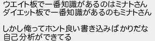 ウエイト板で一番知識があるのはミナトさん ダイエット板で一番知識があるのもミナトさん しかし俺ってホント良い書き込みばかりだな 自己分析ができてる