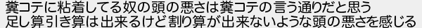 糞コテに粘着してる奴の頭の悪さは糞コテの言う通りだと思う 足し算引き算は出来るけど割り算が出来ないような頭の悪さを感じる