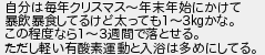 571: (ワッチョイ ed57-E+9A) [sage] 2018/12/23(日) 12:42:40.11 ID:YhSaUr/o0 自分は毎年クリスマス〜年末年始にかけて 暴飲暴食してるけど太っても1〜3kgかな。 この程度なら1〜3週間で落とせる。 ただし軽い有酸素運動と入浴は多めにしてる。 http://rio2016.5ch.io/test/read.cgi/shapeup/1543551721/571