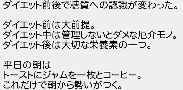 ダイエット前後で糖質への認識が変わった ダイエット前は大前提 ダイエット中は管理しないとダメな厄介モノ ダイエット後は大切な栄養素の一つ 平日の朝は トーストにジャムを一枚とコーヒー これだけで朝から勢いがつく