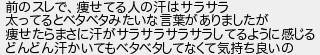 前のスレで痩せてる人の汗はサラサラ 太ってるとベタベタみたいな言葉がありましたが 痩せたらまさに汗がサラサラサラサラしてるように感じる どんどん汗かいてもベタベタしてなくて気持ち良いの