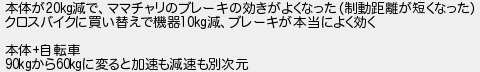 544: [sage] 2019/08/08(木) 20:38:58.84 ID:F933xraY 本体が20kg減で、ママチャリのブレーキの効きがよくなった(制動距離が短くなった) クロスバイクに買い替えで機器10kg減、ブレーキが本当によく効く 本体+自転車 90kgから60kgに変ると加速も減速も別次元 http://rio2016.5ch.io/test/read.cgi/shapeup/1561636282/544