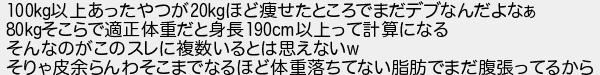 797: [sage] 2020/01/15(水) 15:19:18 100kg以上あったやつが20kgほど痩せたところでまだデブなんだよなぁ 80kgそこらで適正体重だと身長190cm以上って計算になる そんなのがこのスレに複数いるとは思えないw そりゃ皮余らんわそこまでなるほど体重落ちてない脂肪でまだ腹張ってるから http://rio2016.5ch.io/test/read.cgi/shapeup/1561636713/797