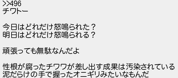 508: [sage] 2020/06/08(月) 23:38:40 ID:huG7r5n9 >>496 チワトー 今日はどれだけ怒鳴られた? 明日はどれだけ怒鳴られる? 頑張っても無駄なんだよ 性根が腐ったチワワが差し出す成果は汚染されている 泥だらけの手で握ったオニギリみたいなもんだ http://rio2016.5ch.io/test/read.cgi/shapeup/1591448430/508