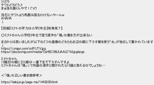 276: [] 2021/02/18(木) 21:12:02.49 ID:QOgS4b12 >>275 チワトどうどう♪ まぁ落ち着くんやで!(^o^) 流石にチワトより馬鹿は居るわけないや〜んw AHAHA ↓ 【悲報】ミナトの学力は小学2年生【新発見?】 ○ミナトちゃん小学校3年生で習う漢字の「様」の書き方が出来ない まさかとは思いましたが以下の2つの画像のどちらも右辺の縦に下ろす線を使う「水」が独立して書かれています ↓ https://i.imgur.com/oofYUTV.jpg https://pbs.twimg.com/media/DsHBC98UUAAQ71M.jpg:large ミナトちゃん 10画目の縦に引く線は一番下まで下ろすんですよ ミナトちゃんは「様」って何画の漢字と聞かれたら15画と答えるのでしょうね… <「様」の正しい書き順参考> https://kakijun.jp/page-ms/1448200.html http://rio2016.5ch.io/test/read.cgi/shapeup/1612373912/276