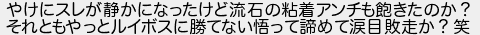 やけにスレが静かになったけど流石の粘着アンチも飽きたのか? それともやっとルイボスに勝てない悟って諦めて涙目敗走か?笑