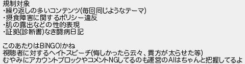 規制対象 繰り返しの多いコンテンツ毎回同じようなテーマ 摂食障害に関するポリシー違反 肌の露出などの性的表現 証拠診断書なき闘病日記 このあたりはかね 視聴者に対するヘイトスピーチ悔しかったら云貴方が太らせた等 むやみにアカウントブロックやコメントしてるのも運営のはちゃんと把握してるよ