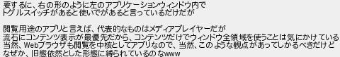 653: [sage] 2017/11/24(金) 01:36:13.15 ID:wor0si6l0 要するに、右の形のように左のアプリケーションウィンドウ内で トグルスイッチがあると使いでがあると言っているだけだが 閲覧用途のアプリと言えば、代表的なものはメディアプレイヤーだが 流石にコンテンツ表示が最優先だから、コンテンツだけでウィンドウ全領域を使うことは気にかけている 当然、Webブラウザも閲覧を中核としてアプリなので、当然、このような観点があってしかるべきだけど なぜか、旧態依然とした形態に縛られているのなwww http://egg.5ch.io/test/read.cgi/software/1506030128/653