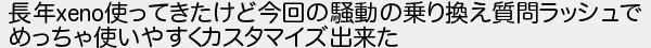 653: [sage] 2023/07/23(日) 11:55:29.19 ID:/5d0WDlG0 長年xeno使ってきたけど今回の騒動の乗り換え質問ラッシュで めっちゃ使いやすくカスタマイズ出来た http://egg.5ch.net/test/read.cgi/software/1689655618/653