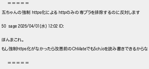 896: [sage] 2026/04/01(水) 20:58:16.75 ID:pMdOE0f00 ===== 五ちゃんの強制 https化による httpのみの専ブラを排除するのに反対します 50 sage 2026/04/01(水) 12:02 ID: ほんまこれ。 もし強制https化がなかったら改悪前のChMateでも5ch.ioを読み書きできるからな ===== http://egg.5ch.io/test/read.cgi/software/1712374947/896