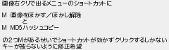画像右クリで出るメニューのショートカットに 画像をぼかすぼかし解除 と ハッシュコピー の2つがあるせいでショートカットが効かずクリックするしかない キーが被らないように修正希望