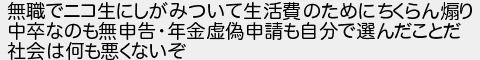 無職でニコ生にしがみついて生活費のためにちくらん煽り 中卒なのも無申告年金虚偽申請も自分で選んだことだ 社会は何も悪くないぞ