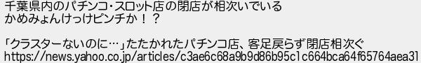 864: [] 2021/05/02(日) 20:06:31.50 千葉県内のパチンコ・スロット店の閉店が相次いでいる かめみょんけっけピンチか!? 「クラスターないのに…」たたかれたパチンコ店、客足戻らず閉店相次ぐ https://news.yahoo.co.jp/articles/c3ae6c68a9b9d86b95c1c664bca64f65764aea31 http://egg.5ch.io/test/read.cgi/streaming/1619706101/864
