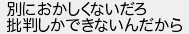 421: [sage] 2021/09/14(火) 01:02:01 ID:UY24vYx30 別におかしくないだろ 批判しかできないんだから http://egg.5ch.io/test/read.cgi/streaming/1630592011/421