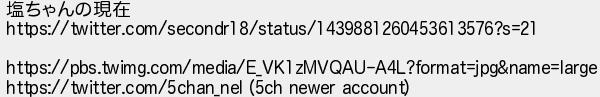 21: [sage] 2021/09/22(水) 07:32:17 塩ちゃんの現在 https://twitter.com/secondr18/status/1439881260453613576?s=21 https://pbs.twimg.com/media/E_VK1zMVQAU-A4L?format=jpg&name=large https://twitter.com/5chan_nel (5ch newer account) http://egg.5ch.io/test/read.cgi/streaming/1632247421/21