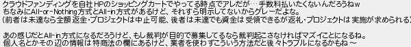 クラウドファンディングを自社のショッピングカートでやってる時点でアレだが手数料払いたくないんだろうね ちなみに方式と方式があるけどそれすら明示してないからグレーだよな 前者は未達なら全額返金プロジェクトは中止可能後者は未達でも資金は受領できるが返礼プロジェクトは実施が求められる あの感じだと方式になるだろうけどもし裁判が目的で募集してるなら裁判起こさなければマズイことになるね 個人名とかその辺の情報は特商法の欄にあるけど業者を使わずこういう方法だと後トラブルになるかもね