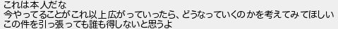 これは本人だな 今やってることがこれ以上広がっていったらどうなっていくのかを考えてみてほしい この件を引っ張っても誰も得しないと思うよ