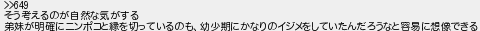 そう考えるのが自然な気がする 弟妹が明確にニンポコと縁を切っているのも幼少期にかなりのイジメをしていたんだろうなと容易に想像できる