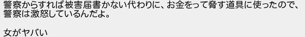 警察からすれば被害届書かない代わりにお金をって脅す道具に使ったので 警察は激怒しているんだよ 女がヤバい