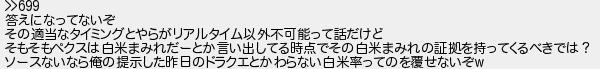 713: [sage] 2022/09/13(火) 03:09:09.42 >>699 答えになってないぞ その適当なタイミングとやらがリアルタイム以外不可能って話だけど そもそもペクスは白米まみれだーとか言い出してる時点でその白米まみれの証拠を持ってくるべきでは? ソースないなら俺の提示した昨日のドラクエとかわらない白米率ってのを覆せないぞw http://egg.5ch.net/test/read.cgi/streaming/1663000697/713