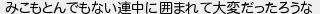 918: [sage] 2022/09/13(火) 03:55:46.24 みこもとんでもない連中に囲まれて大変だったろうな http://egg.5ch.net/test/read.cgi/streaming/1663000697/918