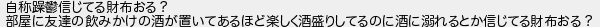 自称信じてる財布おる? 部屋に友達の飲みかけの酒が置いてあるほど楽しく酒盛りしてるのに酒に溺れるとか信じてる財布おる?
