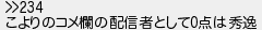 282: [sage] 2022/09/13(火) 06:21:43.51 >>234 こよりのコメ欄の配信者として0点は秀逸 http://egg.5ch.net/test/read.cgi/streaming/1663010648/282
