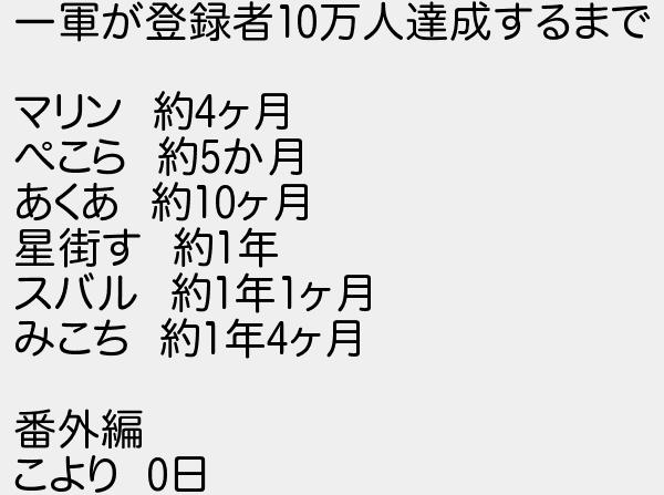 一軍が登録者万人達成するまで マリン 約ヶ月 ぺこら 約か月 あくあ 約ヶ月 星街す 約年 スバル 約年ヶ月 みこち 約年ヶ月 番外編 こより 日