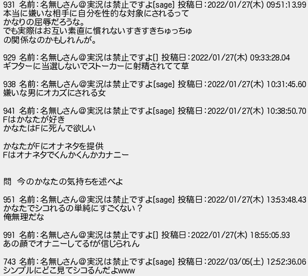 名前名無しさん実況は禁止ですよ 投稿日木 本当に嫌いな相手に自分を性的な対象にされるって かなりの屈辱だろうな でも実際はお互い素直に慣れないすきすきちゅっちゅ の関係なのかもしれんが 名前名無しさん実況は禁止ですよ 投稿日木 ギフターに当選しないでストーカーに射精されてて草 名前名無しさん実況は禁止ですよ 投稿日木 嫌いな男にオカズにされる女 名前名無しさん実況は禁止ですよ 投稿日木 はかなたが好き かなたはに死んで欲しい かなたがにオナネタを提供 はオナネタでくんかくんかカナニー 問 今のかなたの気持ちを述べよ 名前名無しさん実況は禁止ですよ 投稿日木 かなたでシコれるの単純にすごくない? 俺無理だな 名前名無しさん実況は禁止ですよ 投稿日木 あの顔でオナニーしてるが信じられん 名前名無しさん実況は禁止ですよ 投稿日土 シンプルにどこ見てシコるんだよ