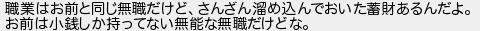 職業はお前と同じ無職だけどさんざん溜め込んでおいた蓄財あるんだよ お前は小銭しか持ってない無能な無職だけどな