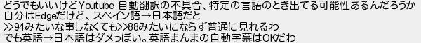 どうでもいいけど 自動翻訳の不具合特定の言語のとき出てる可能性あるんだろうか 自分はだけどスペイン語日本語だと みたいな事しなくてもみたいにならず普通に見れるわ でも英語日本語はダメっぽい英語まんまの自動字幕はだわ