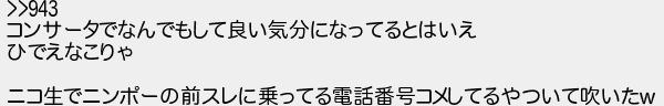 コンサータでなんでもして良い気分になってるとはいえ ひでえなこりゃ ニコ生でニンポーの前スレに乗ってる電話番号コメしてるやついて吹いた