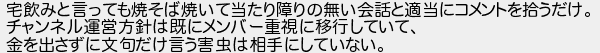 宅飲みと言っても焼そば焼いて当たり障りの無い会話と適当にコメントを拾うだけ チャンネル運営方針は既にメンバー重視に移行していて 金を出さずに文句だけ言う害虫は相手にしていない