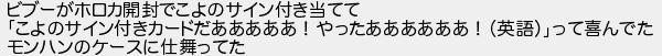 ビブーがホロカ開封でこよのサイン付き当てて こよのサイン付きカードだあああああ!やったああああああ!英語って喜んでた モンハンのケースに仕舞ってた