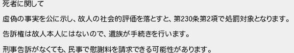 死者に関して 虚偽の事実を公に示し故人の社会的評価を落とすと第条第項で処罰対象となります 告訴権は故人本人にはないので遺族が手続きを行います 刑事告訴がなくても民事で慰謝料を請求できる可能性があります