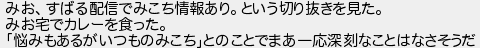 みおすばる配信でみこち情報ありという切り抜きを見た みお宅でカレーを食った 悩みもあるがいつものみこちとのことでまあ一応深刻なことはなさそうだ