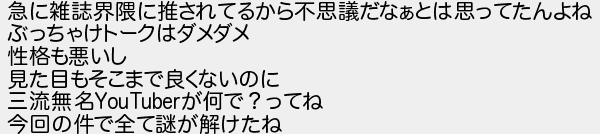 急に雑誌界隈に推されてるから不思議だなぁとは思ってたんよね ぶっちゃけトークはダメダメ 性格も悪いし 見た目もそこまで良くないのに 三流無名が何で?ってね 今回の件で全て謎が解けたね