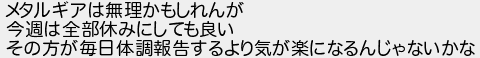 メタルギアは無理かもしれんが 今週は全部休みにしても良い その方が毎日体調報告するより気が楽になるんじゃないかな