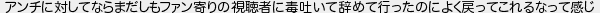 アンチに対してならまだしもファン寄りの視聴者に毒吐いて辞めて行ったのによく戻ってこれるなって感じ