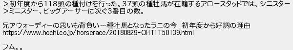 初年度から118頭の種付けを行った37頭の種牡馬が在籍するアロースタッドではシニスター ミニスタービッグアーサーに次ぐ3番目の数 兄アウォーディーの思いも背負い種牡馬となったラニの今 初年度から好調の理由 フム