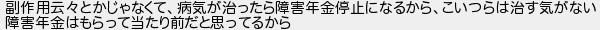 副作用云とかじゃなくて病気が治ったら障害年金停止になるからこいつらは治す気がない 障害年金はもらって当たり前だと思ってるから