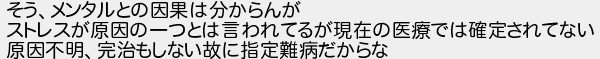 そうメンタルとの因果は分からんが ストレスが原因の一つとは言われてるが現在の医療では確定されてない 原因不明完治もしない故に指定難病だからな