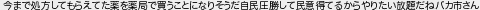 今まで処方してもらえてた薬を薬局で買うことになりそうだ自民圧勝して民意得てるからやりたい放題だねバカ市さん