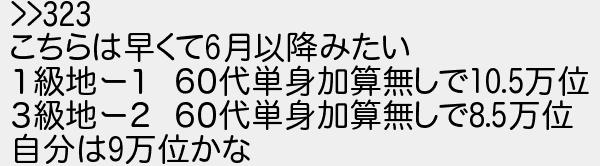 326: (ワッチョイ b9c0-Cl87) [sage] 2026/03/31(火) 19:21:26.13 ID:7n4tkAV10 >>323 こちらは早くて6月以降みたい 1級地ー1 60代単身加算無しで10.5万位 3級地ー2 60代単身加算無しで8.5万位 自分は9万位かな http://mevius.5ch.io/test/read.cgi/utu/1771663646/326