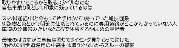 357: (ワッチョイ b905-ta3o) [sage] 2026/04/01(水) 22:30:16.06 ID:3GZ07cbM0 取りやすいところから取るスタイルなのな 自転車乗り側として印象に残っているのは スマホ(通話中)と傘もって片手はタバコ持っていた雑技団系 街路樹と色とかで明確に仕切られているのに専用道路がどこかわかっていない人 車道の分離帯みたいなところで休憩するやばめの高齢者 最後のはさすがに自転車降りてタイミング見計らって助けた 近所の3列歩道爆走の中高生は取り分ないからスルーの警察 http://mevius.5ch.io/test/read.cgi/utu/1771663646/357
